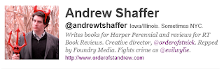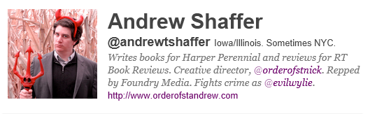Andrew Shaffer, like Chuck Wendig, has a sense of humor that is often a bit warped. And that’s precisely why I enjoy both of their tweets so much. Andrew also has several alter egos that he tweets under, my favorite is